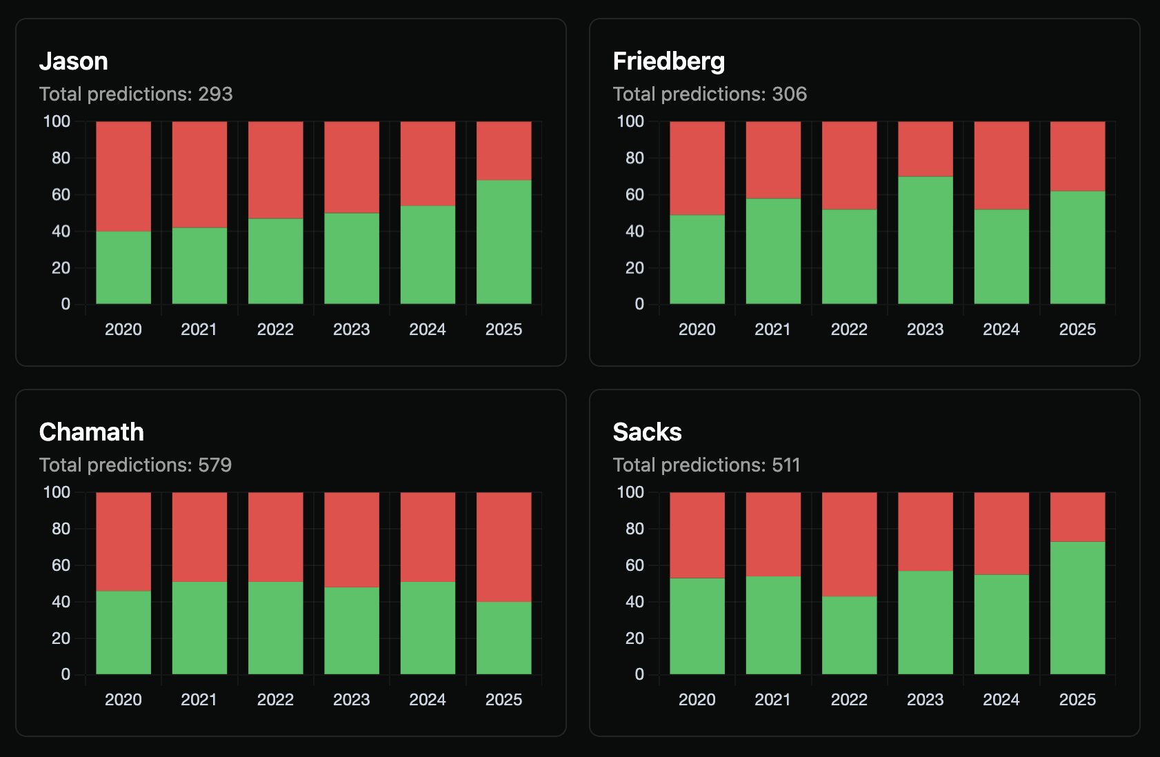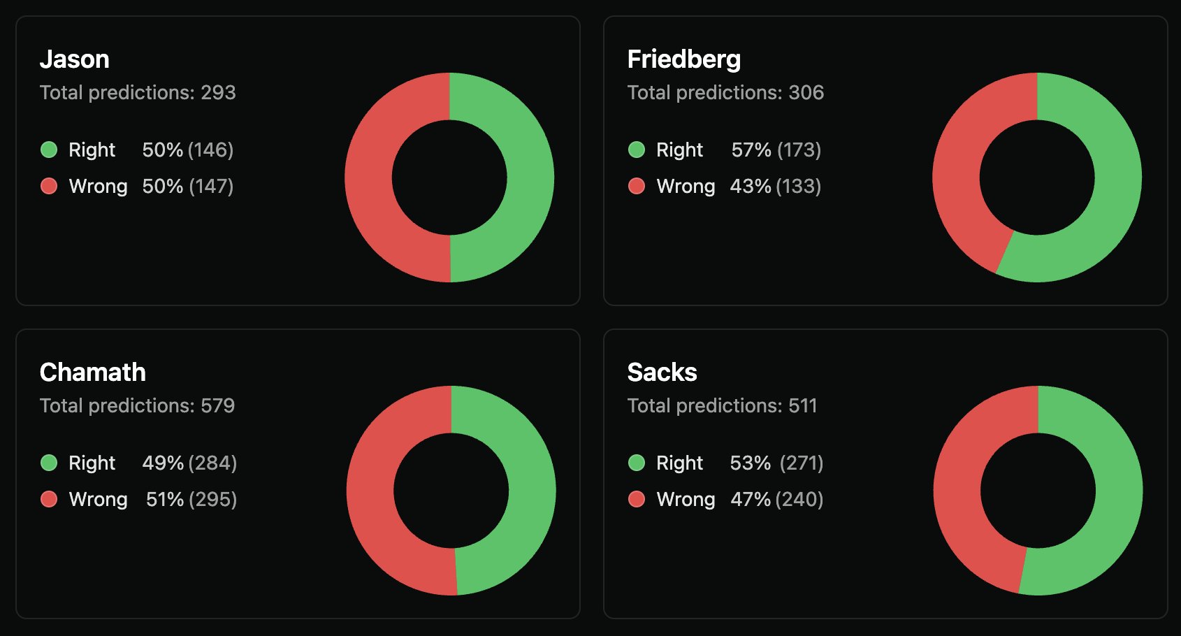 Chamath has the lowest prediction accuracy on the All-In Podcast.