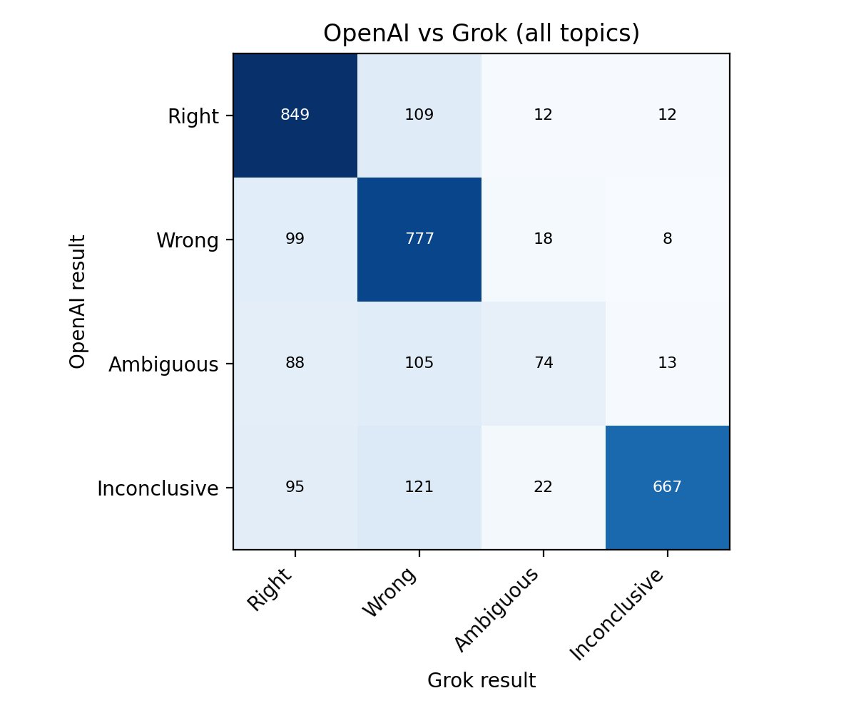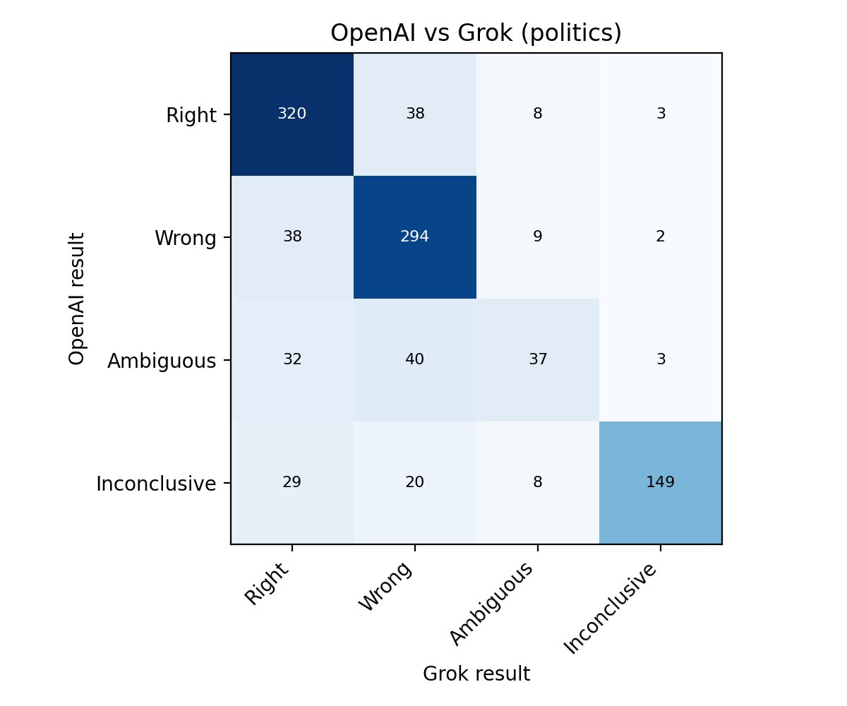 To check for potential LLM bias, I ran the evaluations through both GPT-5.1 and Grok-4.1. The models agree on 89% of Right vs Wrong grades. When they disagree, Grok is more likely to grade as Wrong. Even on political predictions, both models assign the same number of Right grades.